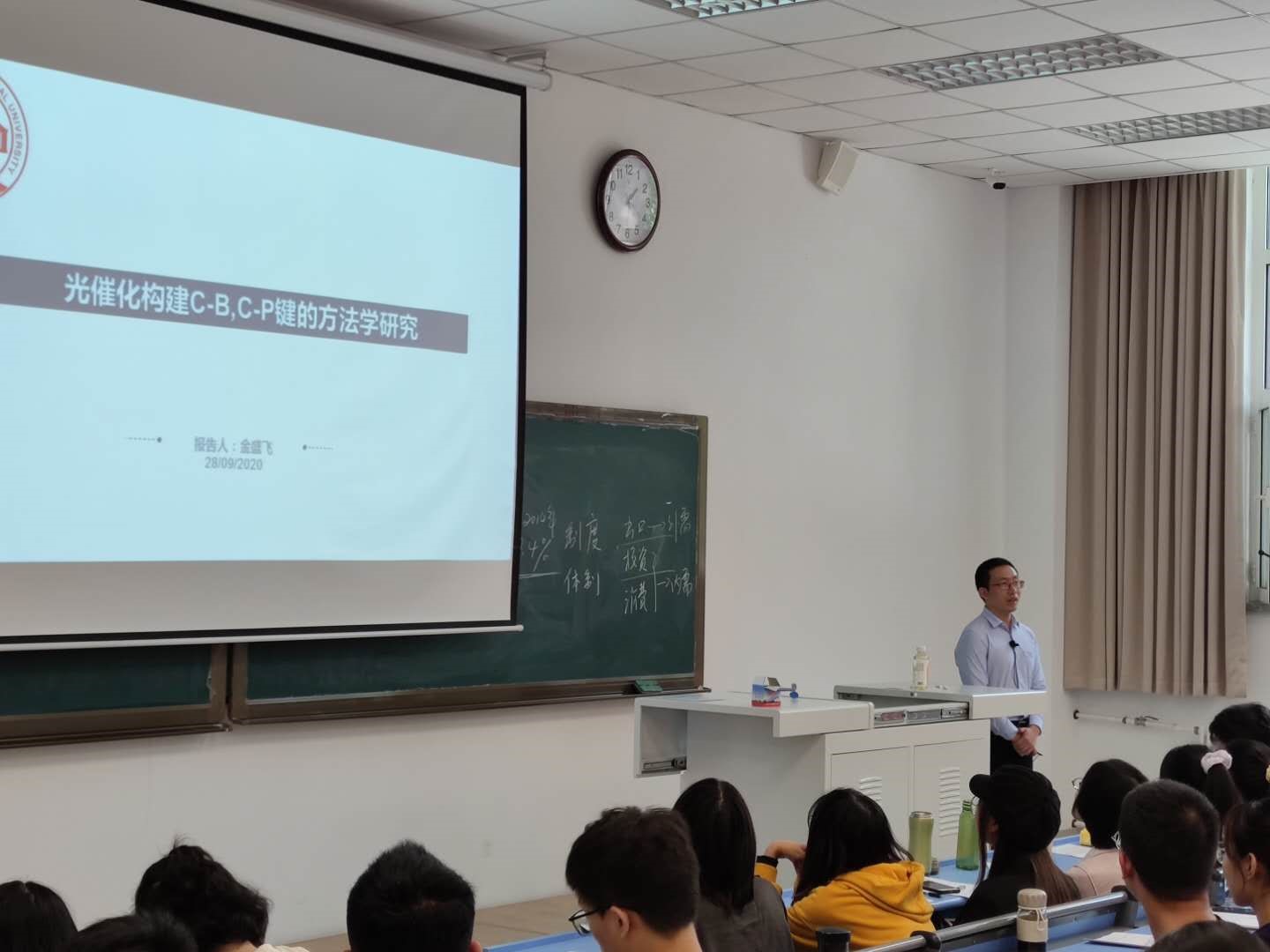 金盛飞博士在本次报告中,着重介绍了光催化的碳杂键的构建方法学研究,包括:C-B、C-P键构建,碳硼化缩环反应等。详尽地为老师同学们介绍了光催化构建C-B键的简便性与普适性,以及光催化简单构建C-P键在发展小分子配体上的潜力以及潜在的商业价值。