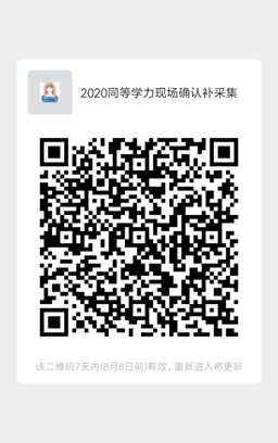 为配合做好2020年同等学力全国统考工作,学校拟定于2020年8月15日为未完成同等学力“信息平台”现场信息确认的申请人安排现场确认及补采集。由于疫情原因,将根据报名人数合理安排采集时间段,请参加补采集的学员扫描下列二维码进入微信群报名,报名截止时间2020年8月10日。具体采集时间和地点将在微信群后续发布。