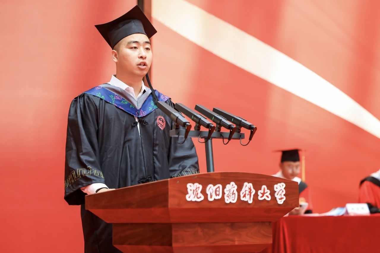88期药学专业本科生张朕作为本科毕业生代表发言。他深情回顾了六年沈药时光——从怀揣药学梦的新生,到淬炼成钢的退伍军人,再到重返校园的追梦者。作为辽宁省优秀毕业生、学校首任雷锋兵预征班班长,他将军人坚韧融入学业,以优异成绩考取本校研究生。他表示,将永葆“药济天下”的初心,在新时代征程中续写沈药人的荣光。