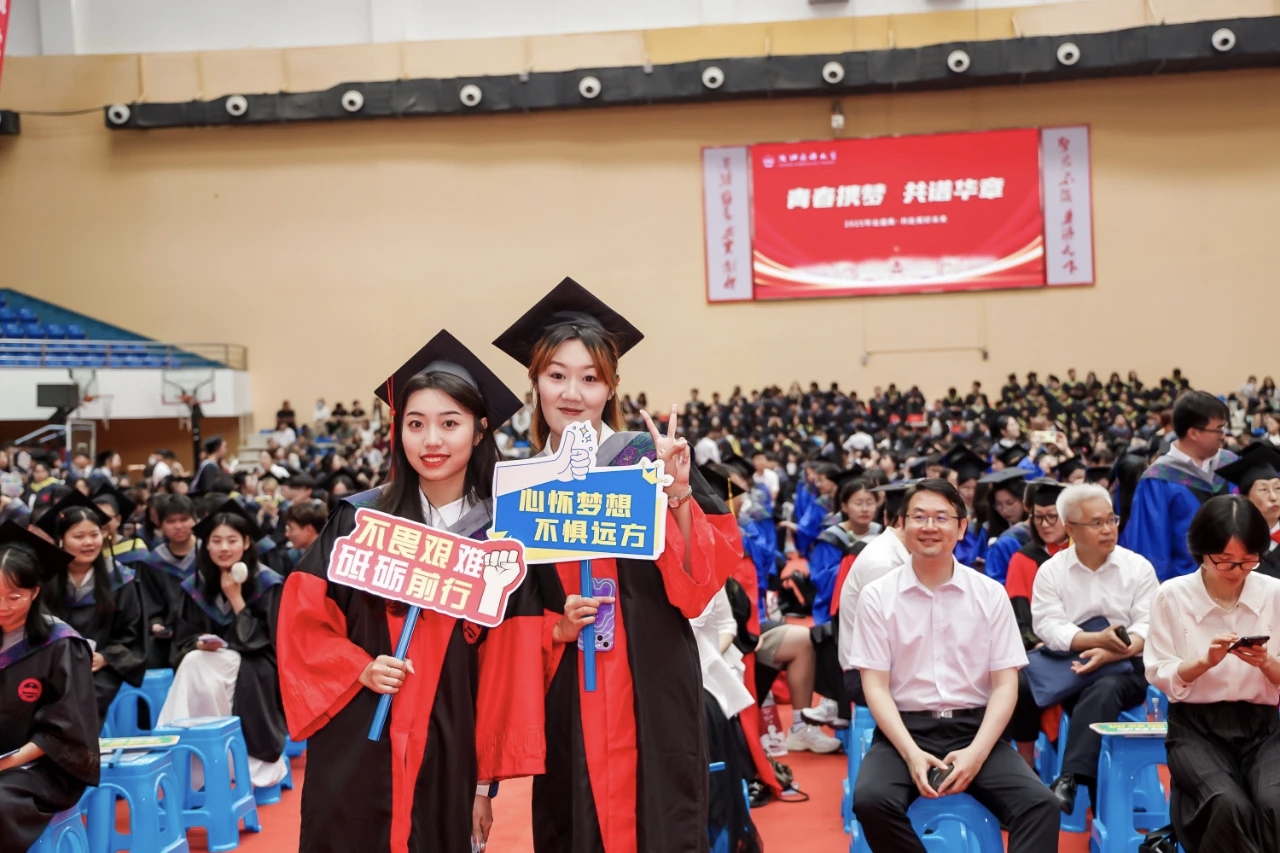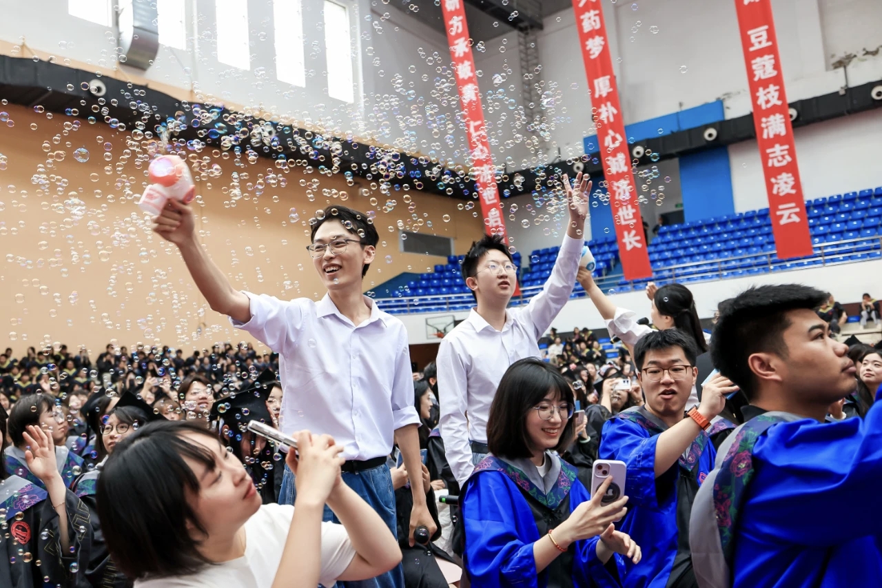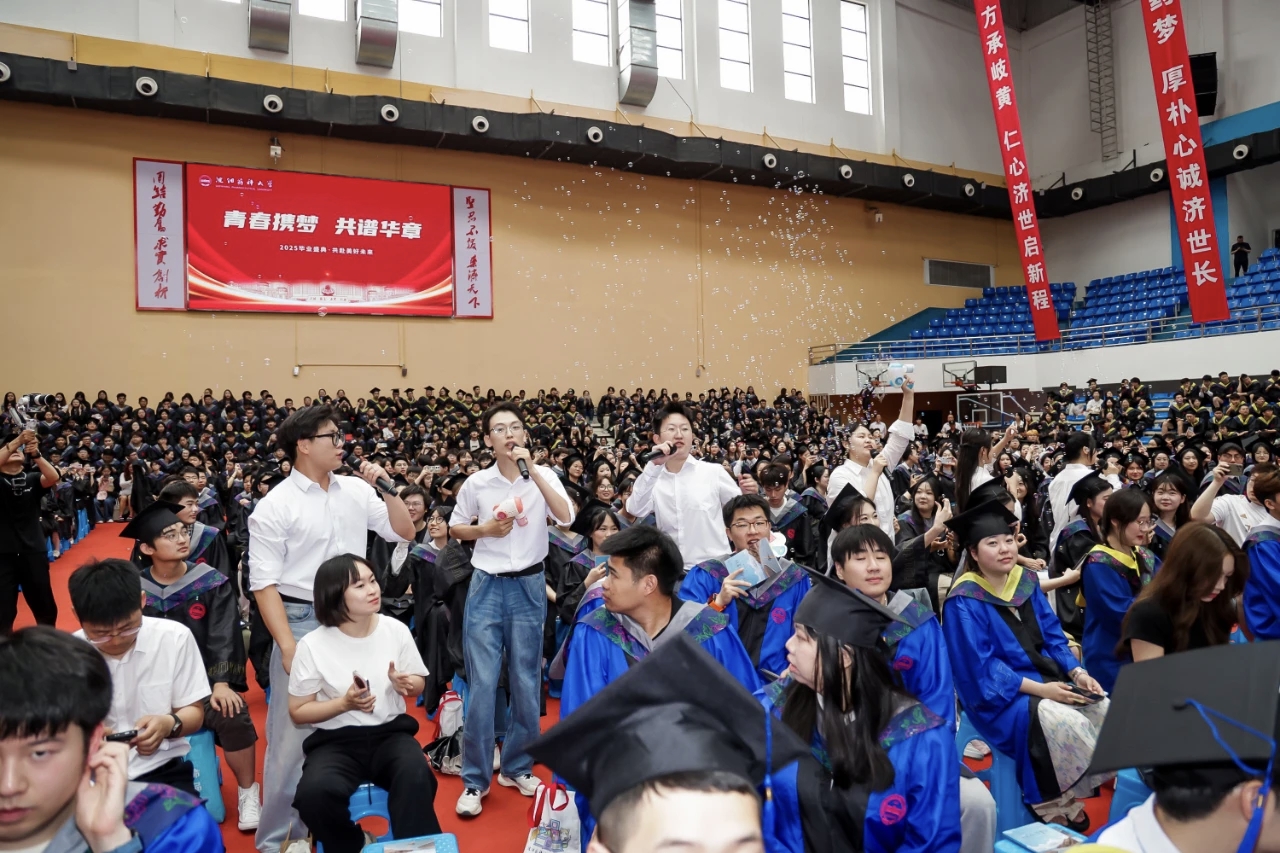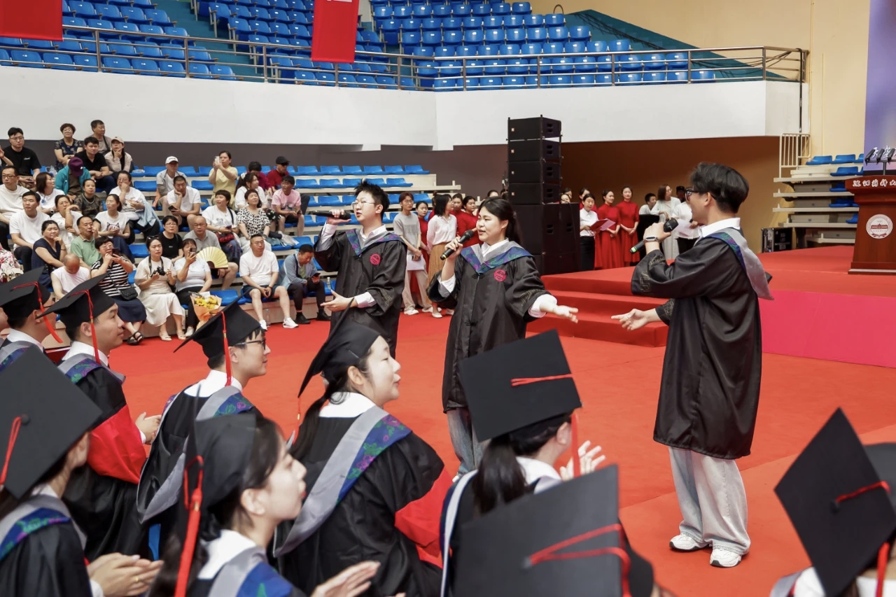 典礼开幕前,现场师生观看了来自五湖四海校友们的暖心祝福,欣赏了师生共同演绎的青春曲目,师生、同窗和校友的浓浓情谊点燃全场,为庄严的毕业典礼注入温暖底色。
