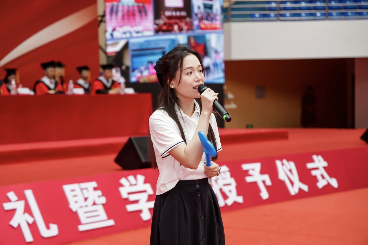 高明宇为2025届毕业生代表颁发校友联络员聘书。这既是对毕业生过去深耕学业的认可,更是对未来荣耀母校的期许。他希望毕业生在新的人生征程中,无论身在何方,都能情系校友、心系母校,发挥好桥梁纽带作用,以高度的责任感与使命感,广泛凝聚校友力量,实现个人事业进步与促进母校发展同频共振。