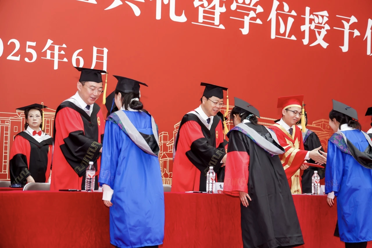 2025届全体博士毕业生,以及硕士毕业生和本科毕业生代表依次登台,主席台学位评定委员会委员为他们颁发学位证书、拨穗正冠,祝贺毕业生们圆满完成学业、开启人生新篇章。